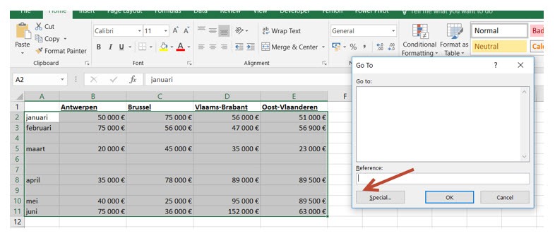 – Selecteer uw bereik (of met Ctrl + A als u de lege cellen wilt verwijderen in de volledige Excel sheet)