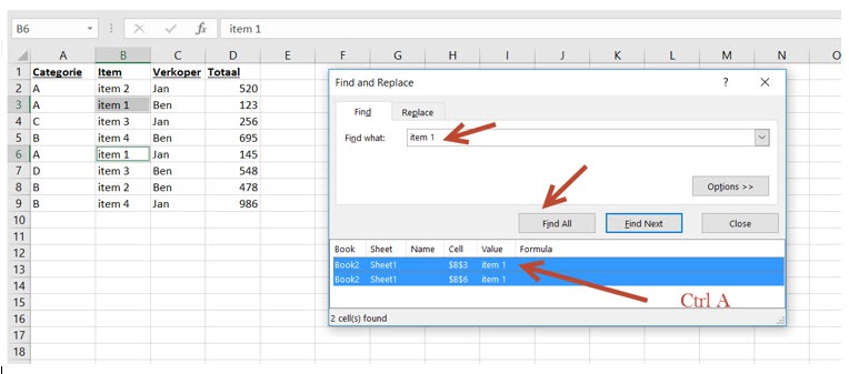 – Klik daarna op Find All. Er verschijnt een lijstje met alle cellen waarin ‘item 1’ aanwezig is. Daarna klikt u op Ctrl + A om alle cellen te selecteren.