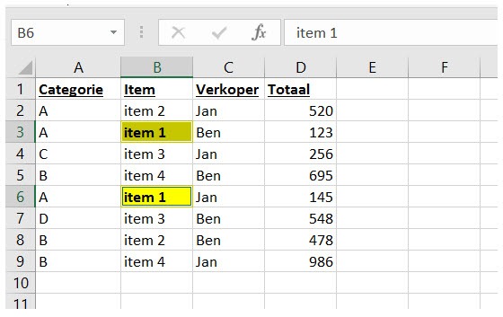 – U kunt nu van alle cellen met ‘item 1’ de opmaak wijzigen (bv: in vet, gele achtergrond, …)