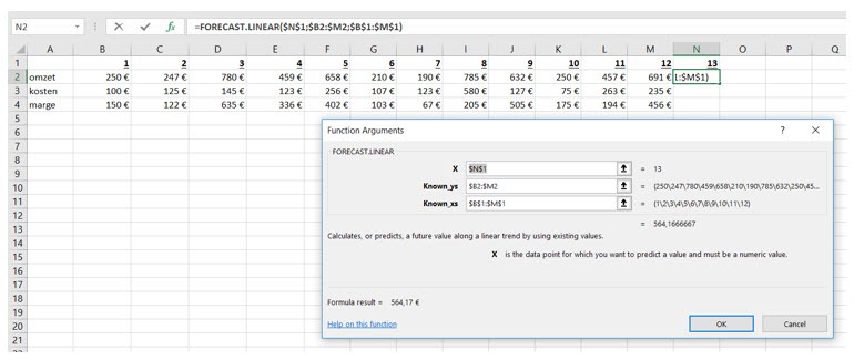 o Known_ys = de gekende cijfers of gegevensbereik uit de voorgaande periode (in ons voorbeeld is dit de omzet van periode 1 t.e.m. 12 of bereik B2:M2)
