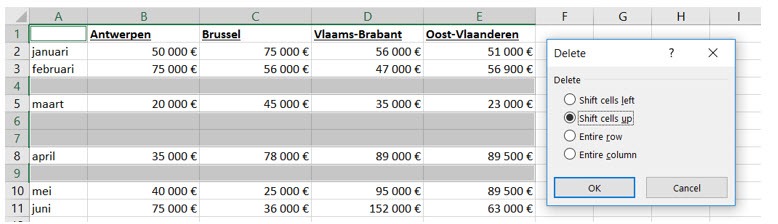 – In ons voorbeeld kiest u voor ‘Shift cells up’ of voor ‘Entire row’ als het om volledige blanco lijnen gaat