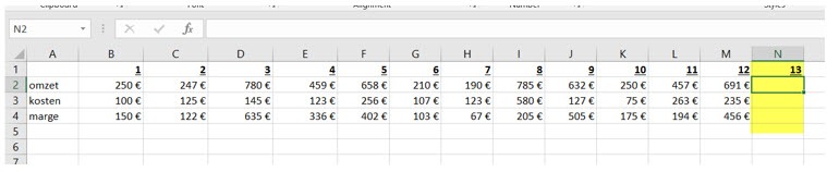 – Stel dat u in onderstaand voorbeeld wilt weten wat de verwachte omzet, kosten en marge zullen zijn in periode 13 (kolom N)