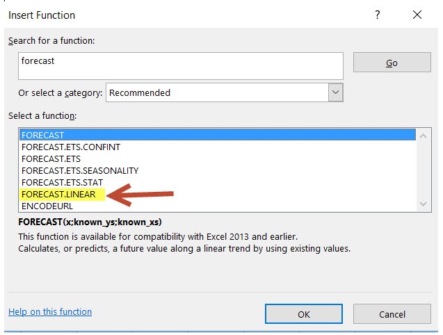 – In de keuzelijst selecteert u ‘FORECAST.LINEAR’ en drukt u op OK
