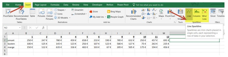 – Ga naar het tabblad ‘Insert’ en kies daar voor het onderdeel ‘Sparklines’