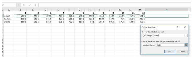 o Location Range = de cel waarin de sparkline moet geplaatst worden