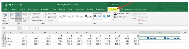 – De sparkline wordt toegevoegd. Daarnaast verschijnt er bovenaan ook een extra tab ‘Design’